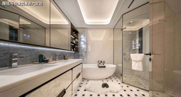 主卫更是下了血本:KA浴缸、双台盆、大理石拼花地面,还有独立的美妆冰箱。女主人看了很难不心动。