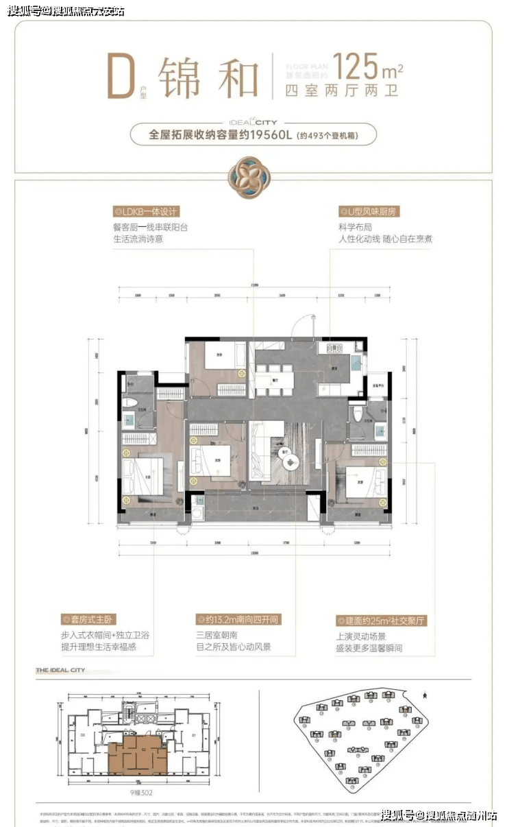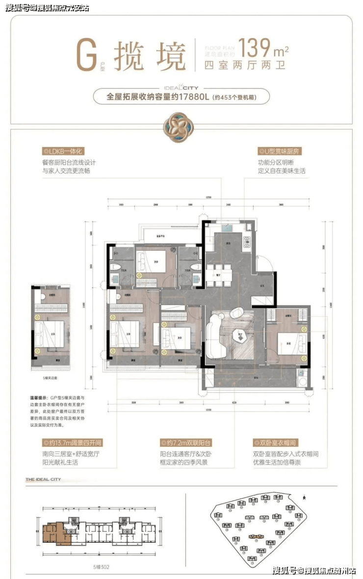 建面约107㎡户型,则把重点放在舒适度上。阔绰方厅+双联阳台,通风赏景至佳,还有U型厨房,三面操作空间,动线流畅好用;套房式主卧更配置了步入式衣帽间,独立卫浴设计,保证了主人家的隐私和仪式感。