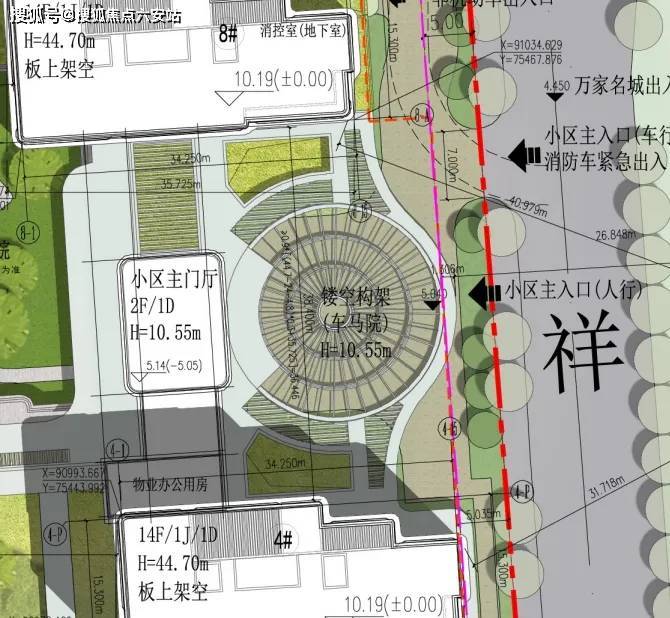 小区正大门位于东侧,也就是万家名城一侧,圆形镂空构架看起来会非常壮观: