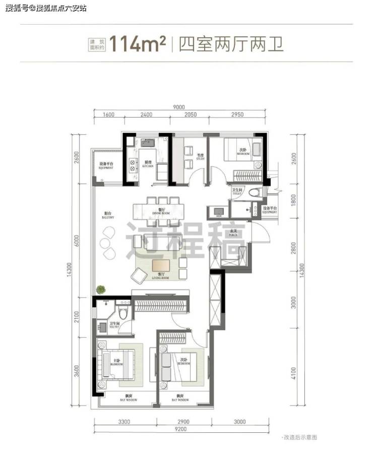 当然,预算更高的可以看看——建面约114方四房两卫。