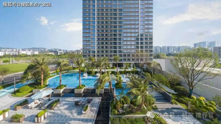 度假式园林:“一轴四境”水系景观,400㎡热带戏水池+半封闭架空层泛会所