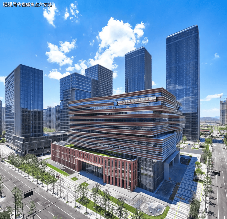 项目总建筑面积约95万㎡,涵盖独栋办公、科创大平层等业态,标准层4.79米挑高,270°环幕视野,得房率超85%。外立面采用银灰Low-E玻璃幕墙+金属格栅,融合浙大校徽元素,获LEED金级与WELL健康双认证,为企业打造绿色智慧办公空间。