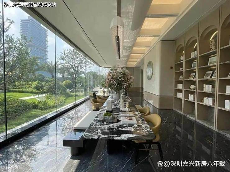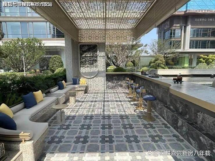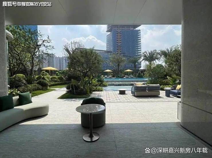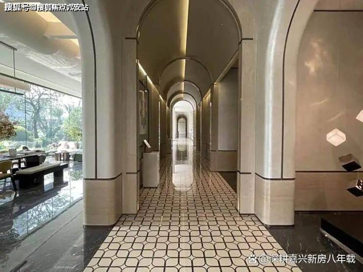 架空层空间也很丰富。7号楼架空层不仅有艺术走廊,还有独立书吧、休闲区等,往外看去就是绿植和蓝色景观水池。