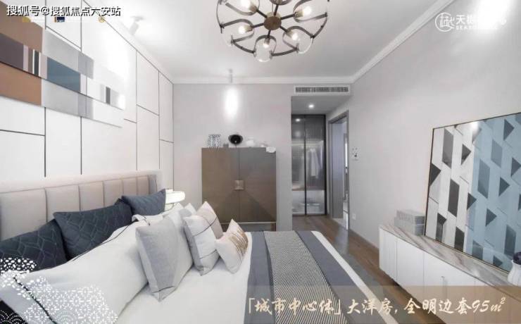 95平方米户型:设计为三室两厅两卫的格局,南向三开间,采光面达到约10米,客餐厅一体化设计,动静分离,尺度阔绰。主次卧分置客厅两边,私密性强,双卫设计让生活更加便捷。