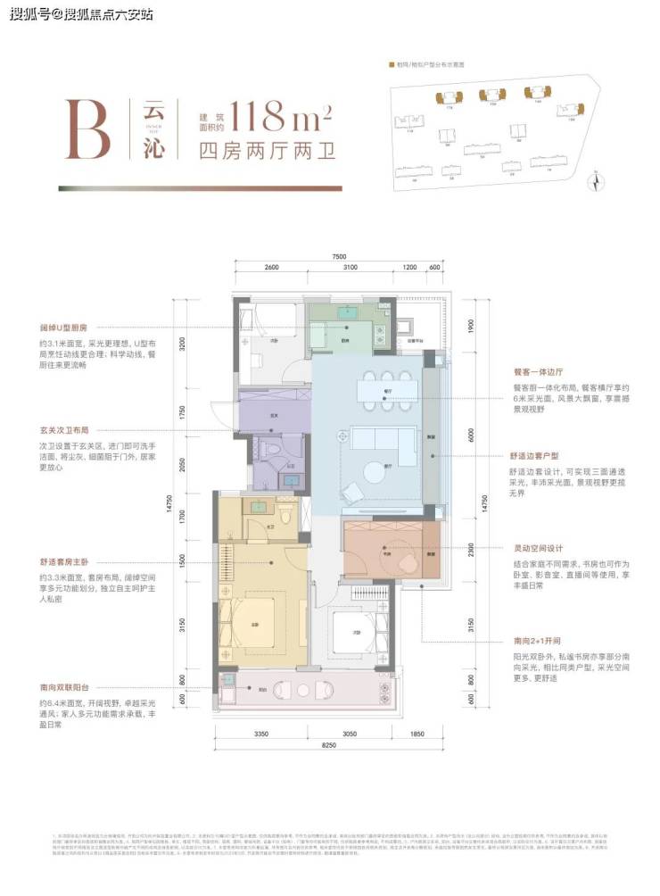 约118㎡户型,约6米宽餐客横厅、三开间朝南、书房270°转角窗,舒适品质边套。