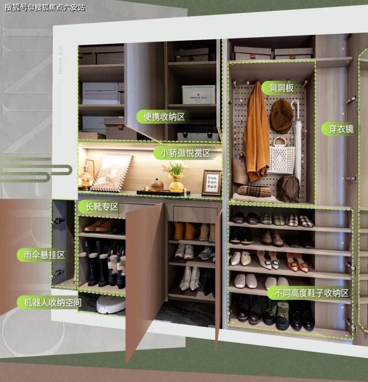博洛尼玄关柜(除E户型),内置长靴与雨伞悬挂区,并配穿衣镜和洞洞板,预留扫地机器人收纳空间,高效有序。