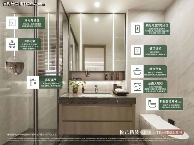 主卫科勒智能马桶,唯宝台盆(103户型为定制岩板一体台盆)、高仪龙头、花洒、通高镜柜(内置插座)、淋浴背景墙;次卫唯宝马桶,臻享私密独处时光。