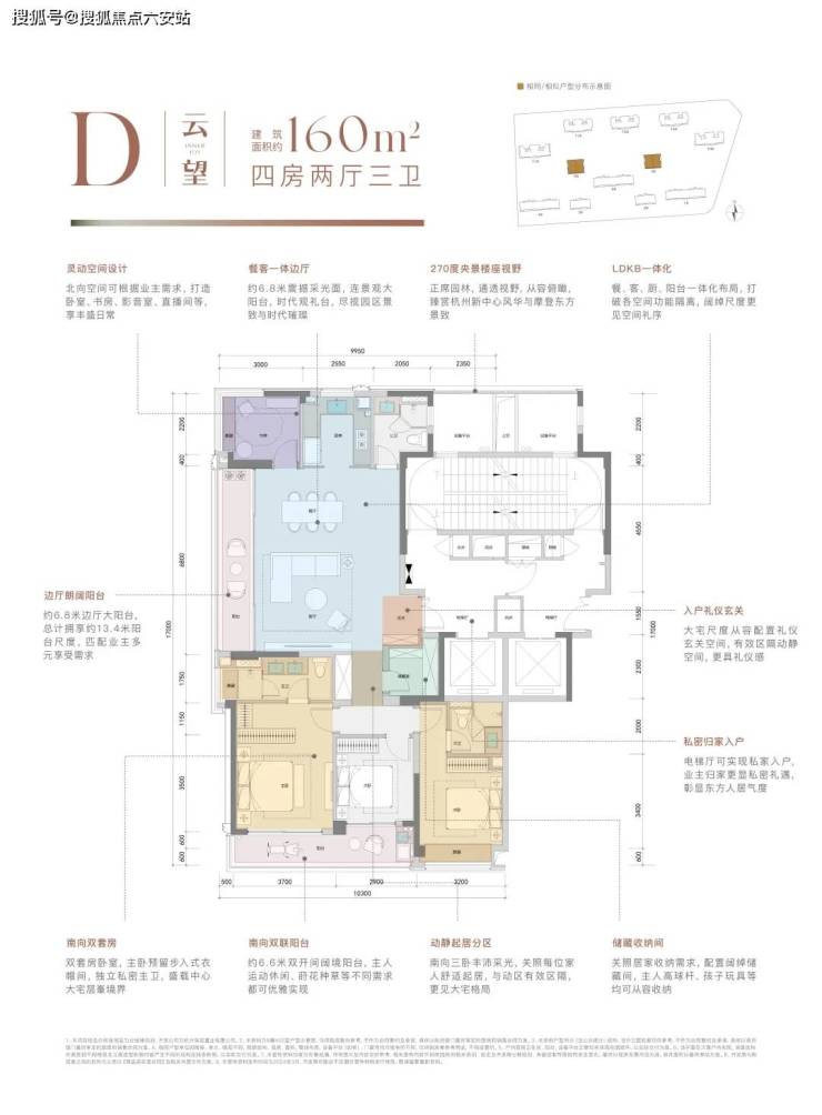 约160㎡楼王户型,两大双联阳台、双套房卧室、主卧双台盆、独立储藏室、两梯两户“地毯式”入户,央景楼座奢境。