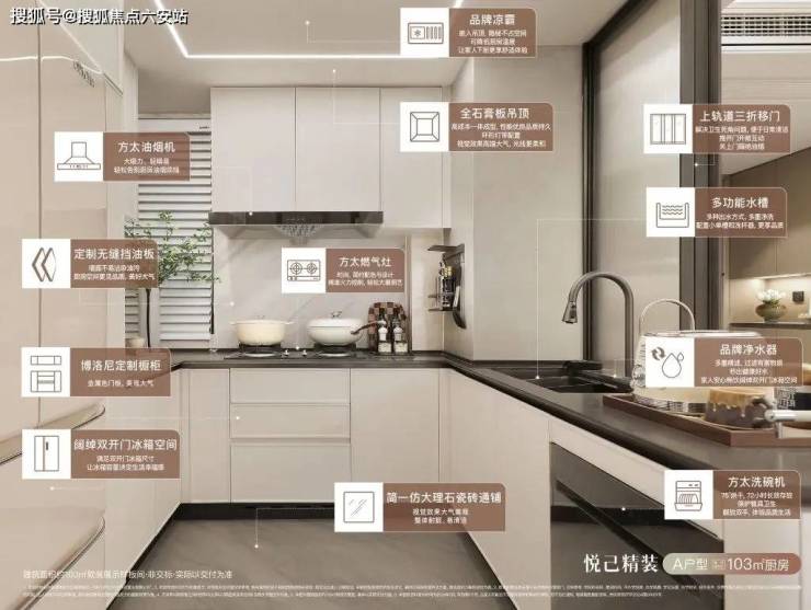 我们举一个小细节。云珹瑧悦府约103方的户型是整个云城门槛最低的小户型,但是,它的半开放厨房让这样的小户型也拥有了带水槽的类岛台,而且还是当下杭州楼市少见的「瀑布水槽」。