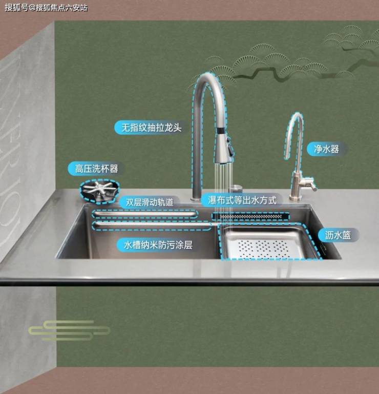 飞雨瀑布水槽+净水器,瀑布式出水方式,配合沥水篮,方便清洗水果、蔬菜;无指纹抽拉龙头,水柱、花洒、刮洗三种出水;刀片式刮洗强力冲击去油污;水槽纳米防污涂层,清洁无死角;双层滑动轨道可承接菜板、沥水篮等,方便操作;高压洗杯器,杯内全洗涤。