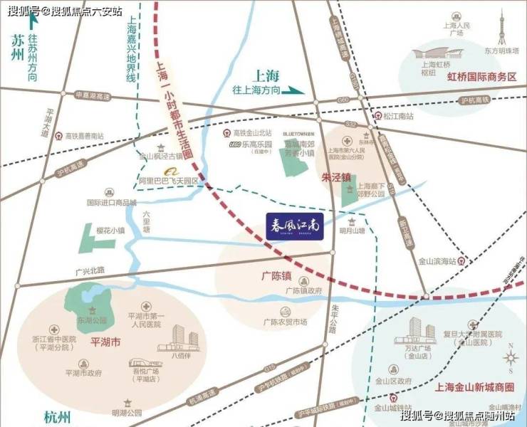 与上海金山廊下仅一河之隔,距金山北高铁站约20公里,距莲廊专线约2.5公里,平沪两地将实现“半小时高铁圈、一小时通勤圈”。