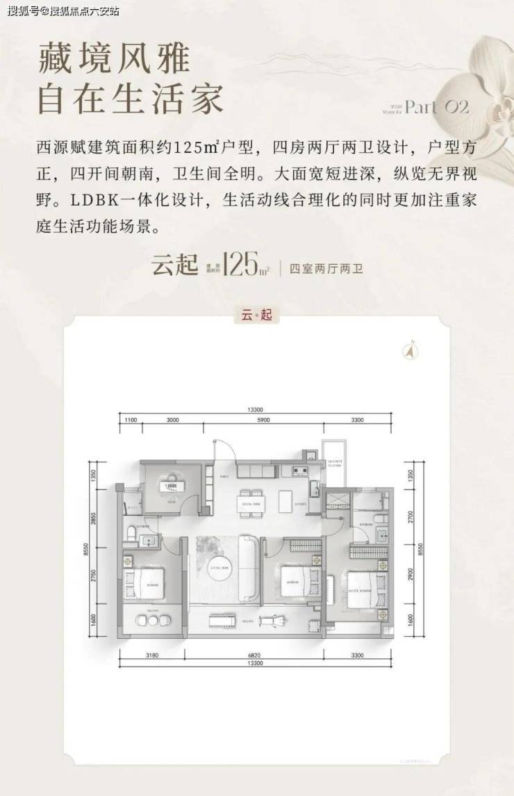 建面约125㎡户型:约6.8米阔景观阳台延展生活视界,将四季风光引入日常;LDKB一体化宽厅设计,打破空间边界,营造通透敞阔的社交场域;南向约13.3米面宽,纳尽阳光清风,光影随心而动。