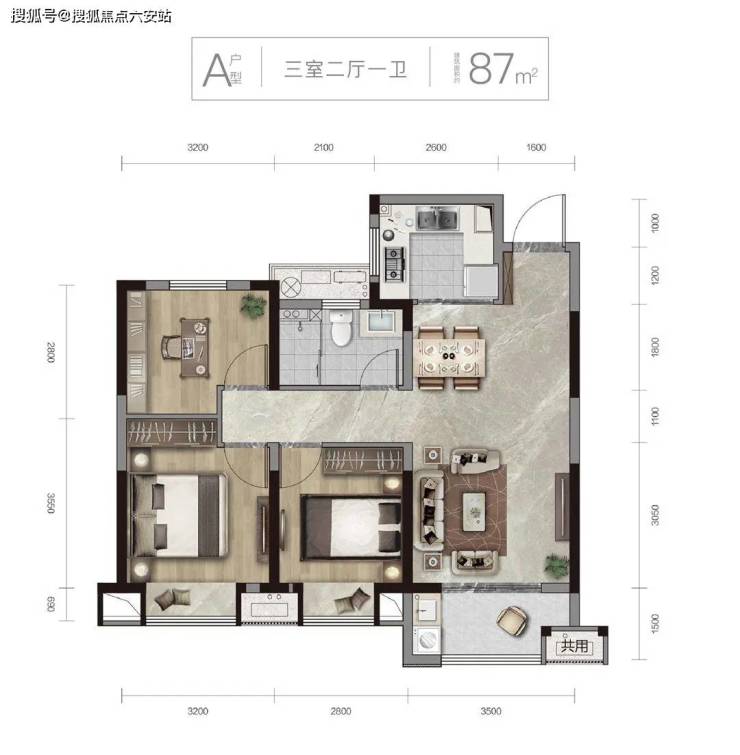 A户型 朗璟 建面约87㎡ 三室二厅一卫