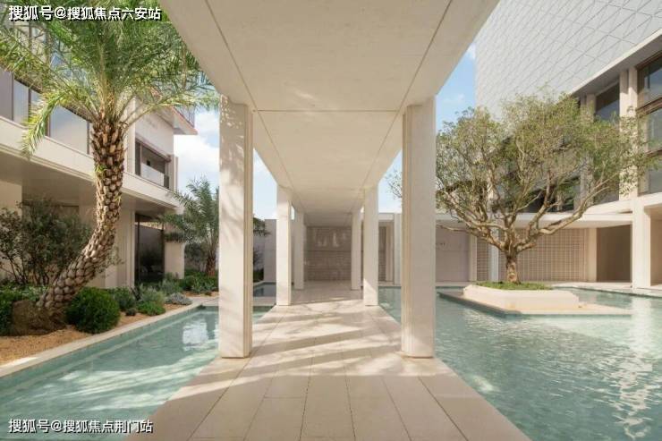 为此他们反复调试了水院底部的瓷砖颜色,以及水的深度,让它与纯色系的石材柱廊、立面,彼此呼应。同时,整个水系也用了和泳池类似的净水系统,不光要在销售阶段保持纯净,今后交付了,同样要打理得纯净透亮。
