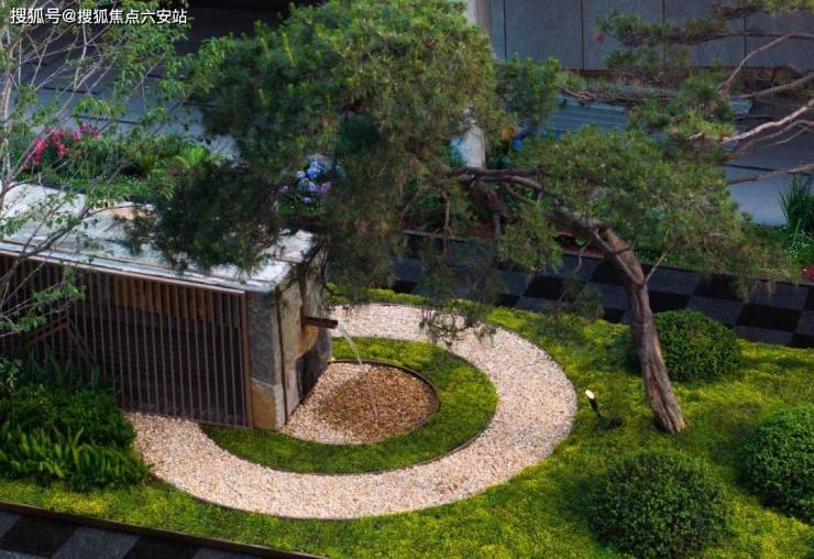 踏入全新示范区实景的那一刻,就被眼前草坡与虎皮黄石材的搭配所吸引,草坡如同自然岛屿,地砖则犹如流动的水流,这种虚实相生的设计,共同打造出了一片别致的枯山水景致。