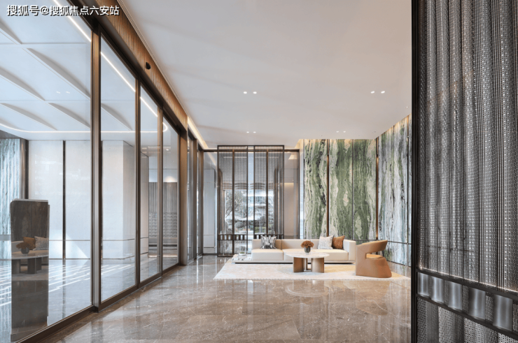 一路走到电梯厅,温德姆灰、维多利亚绿,不同造型的金属格栅和软包“目不暇接”,这种基调的入户大堂,在大平层市场里都没看到几个,很难想象这是一个限价的项目。