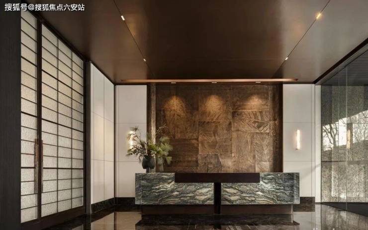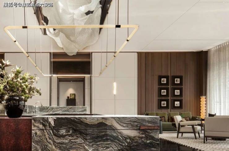 为了实现尊贵雅致的归家仪式感,打造“五境归家”动线,约37米延展面的府院式大门、约4米挑檐星空顶及尊贵酒店式落客和parda绿奢石,勾勒出每一步皆静奢的归家质感。而在入户电梯厅,经典纹样的瓷砖拼花,搭配雪山银狐岩板和精美壁灯,让业主的每次回家都被温馨氛围包裹。