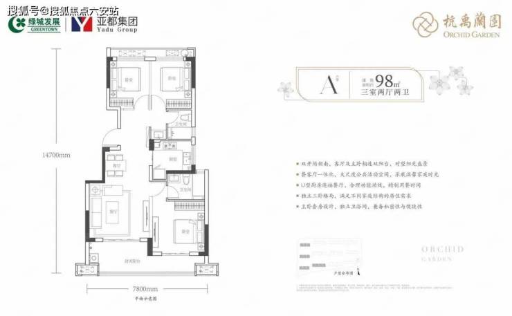 98㎡户型:三房两厅两卫,约240套。