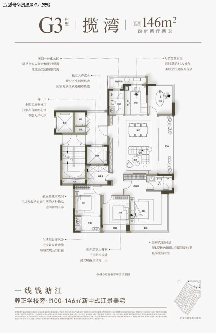 建面约146方则分为横竖两款,全部一线朝江。两梯两户,都有独立电梯厅。“横版”是四开间朝南+大方厅,“竖版”有大边厅+超长转角飘窗的“全景舱主卧”。