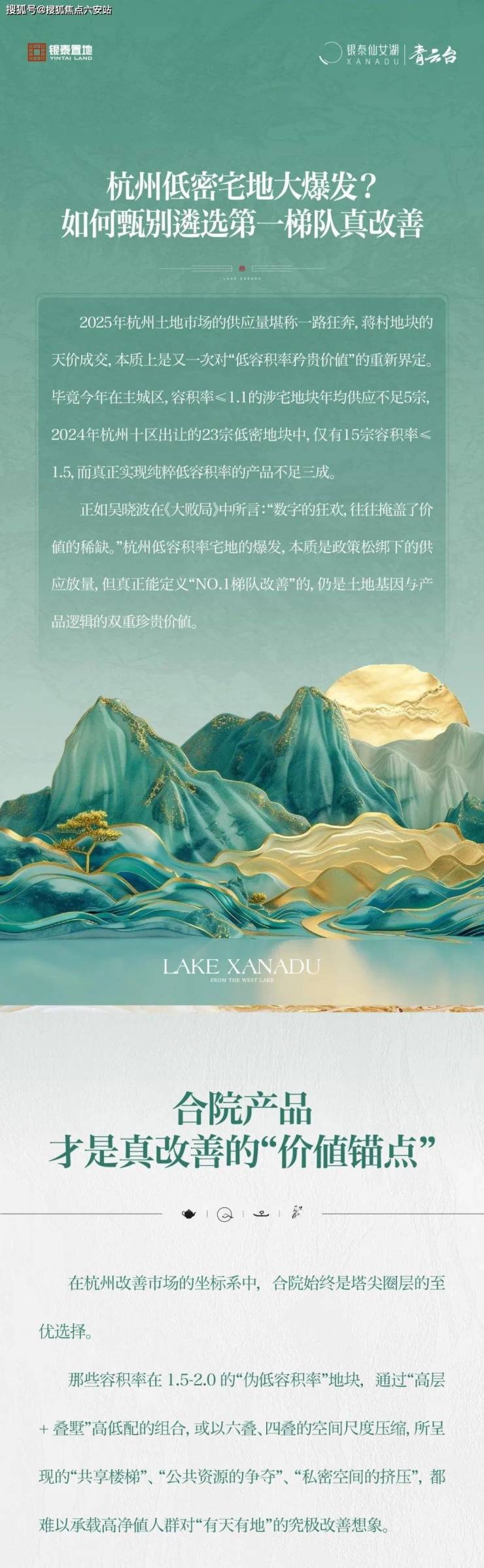 在杭州高端住宅市场中,低密合院产品始终备受瞩目。银泰仙女湖|青云台,作为杭州城南罕有的纯低密合院住区,以其一线湖景资源、宋风美学设计、稀缺容积率和复合业态规划,成为当前市场中兼具品质与性价比的标杆之作。