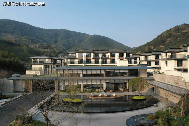 项目以《千里江山图》为灵感蓝本,采用歇山顶、格栅窗、竹纹景墙等宋式元素,搭配蓝眼睛石材与铝板幕墙,形成“新宋风”建筑语言。每栋合院均享**退台式立体庭院**,最高达12米的垂直绿化让建筑隐于山林。