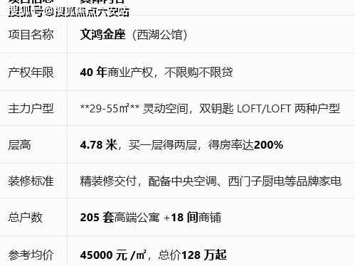 文鸿金座(又称文鸿金座・西湖公馆)是杭州西湖区黄龙 CBD 核心的现房精装公寓,主打4.78 米层高 LOFT 与双钥匙小户型,以低门槛、高回报、核心地段为主要卖点。®营销中心: VIP-Line: 400 811 3125 , ☎ 137 5083 8221﹝已认证﹞