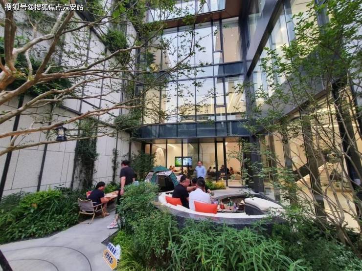 从露台俯瞰,社区广场也做好了,像是小天目里,涌泉跌水、乌桕草坪,还有座50年代的历史保护建筑,将会有咖啡、烘焙,沿着商业街展开,给这片广场带来松弛的度假氛围。
