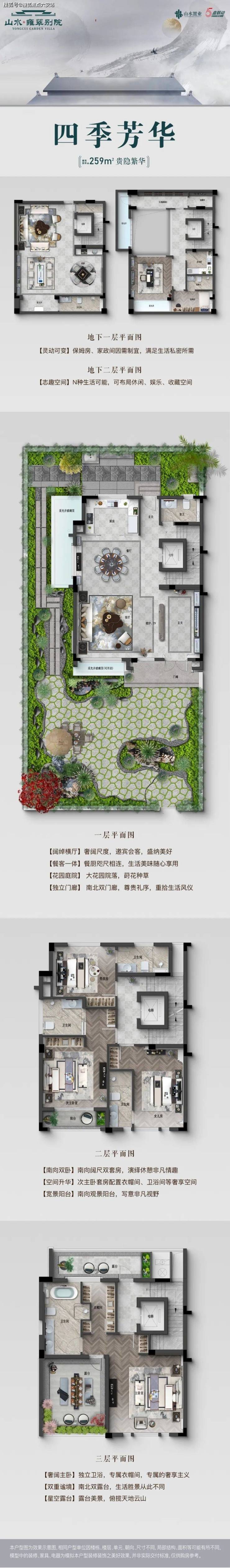 雍翠别院的排屋户型也很纯粹:只有建面约201方和259方两个户型,全部为地上3层+地下2层空间。独门独院、前庭后院、星空双露台。
