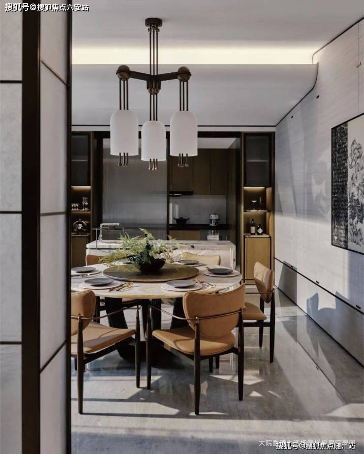 材质考究:地面铺设月光灰大理石;背景墙以卷轴形式展开,饰以烟雨江南大理石,呈现精致宋韵的生活质感。