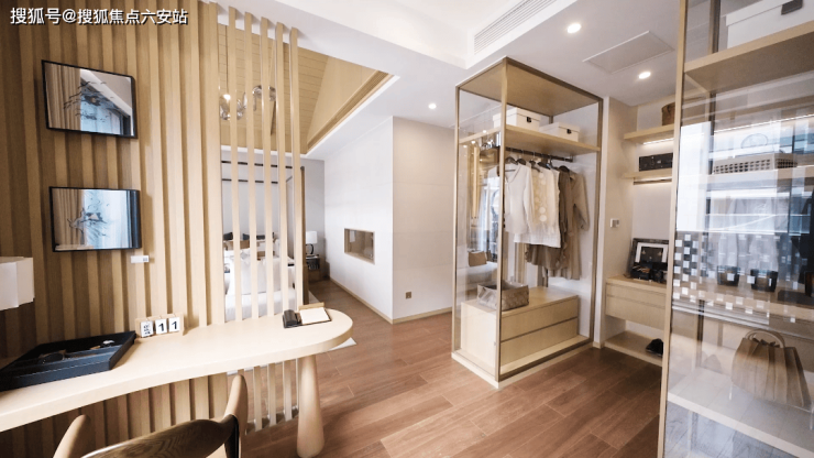 沿着楼梯我们来到二楼,为了增加体验感,样板房将其中一个卧室打造成主卧的独立衣帽间,这也使得主卧更像五星级酒店套房。