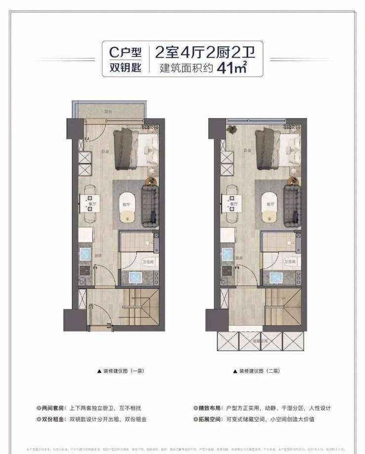 项目装修建议做成Loft和双钥匙户型。主力户型面积在32㎡和41㎡。其中32㎡的Loft装修主要集中在2、5号楼,41㎡的双钥匙装修主要集中在3、4号楼。