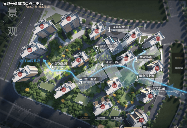 以“水”为元素,打造近 400m的归家动线,用场景代替场地谱写生活意境。