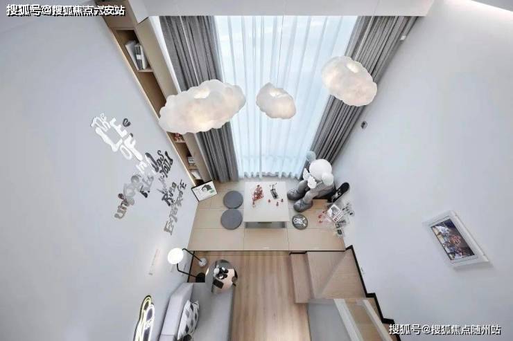 平层的层高约3.3米,自带夹层空间。可以布置成休息区,再搭配精致的小酒柜,设计感满满。
