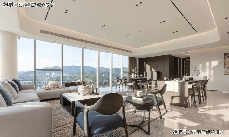 建面约310㎡户型为银湖板块唯一在售精装大平层,采用三面超白玻幕墙设计,单层3.85米层高,70-75㎡无梁大板客厅,270°转角落地窗引景入室。