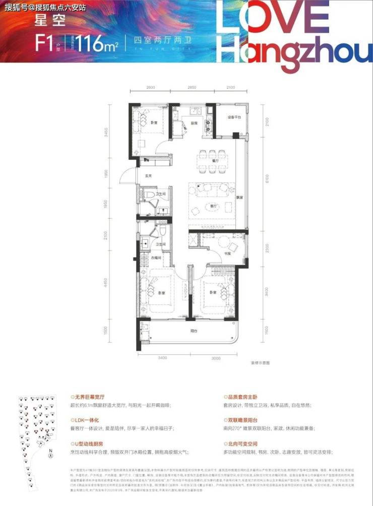 另外,边套同样提供两种选择,建面约98㎡三房与建面约116㎡四房,他们都带有巨幕宽厅,餐客厅一体化,南向双卧室,尺度略有不同,丰俭由人。