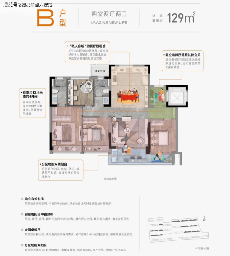 B户型丨四室两厅两卫丨建筑面积约129㎡