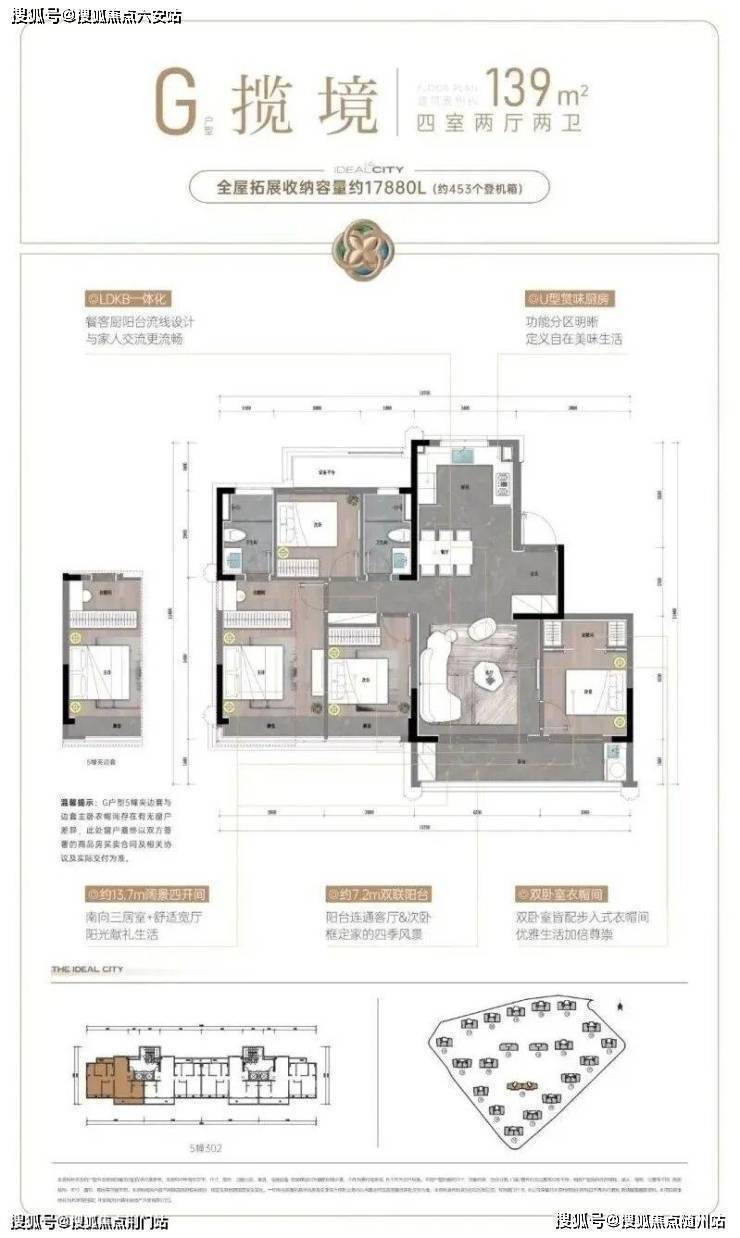 建面约107㎡户型,则把重点放在舒适度上。阔绰方厅+双联阳台,通风赏景至佳,还有U型厨房,三面操作空间,动线流畅好用;套房式主卧更配置了步入式衣帽间,独立卫浴设计,保证了主人家的隐私和仪式感。