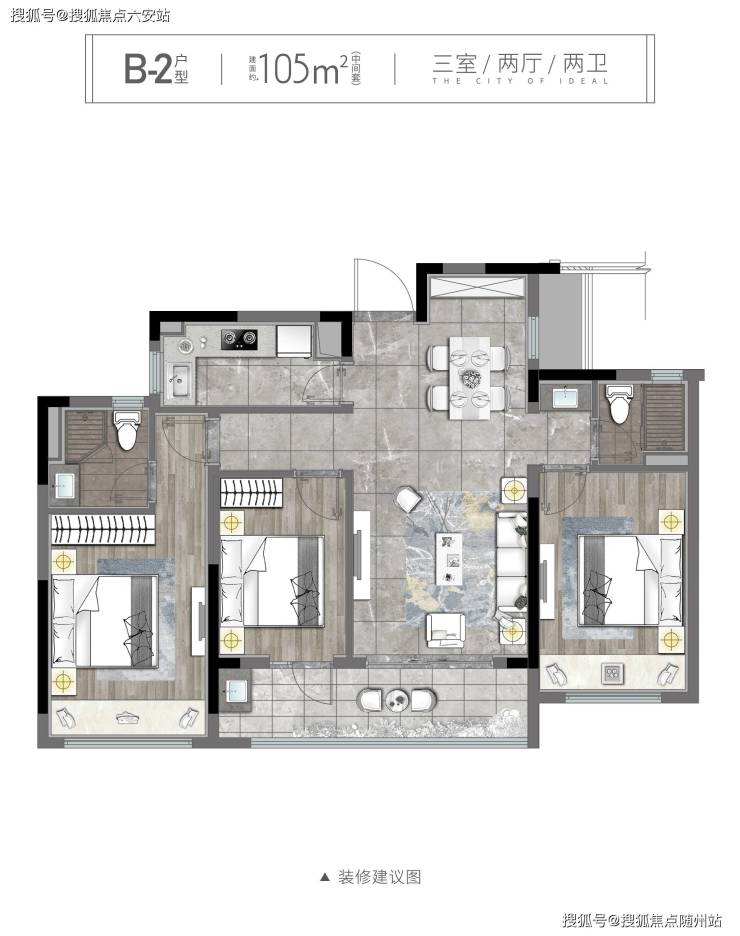B-2户型105㎡:三房两厅两卫