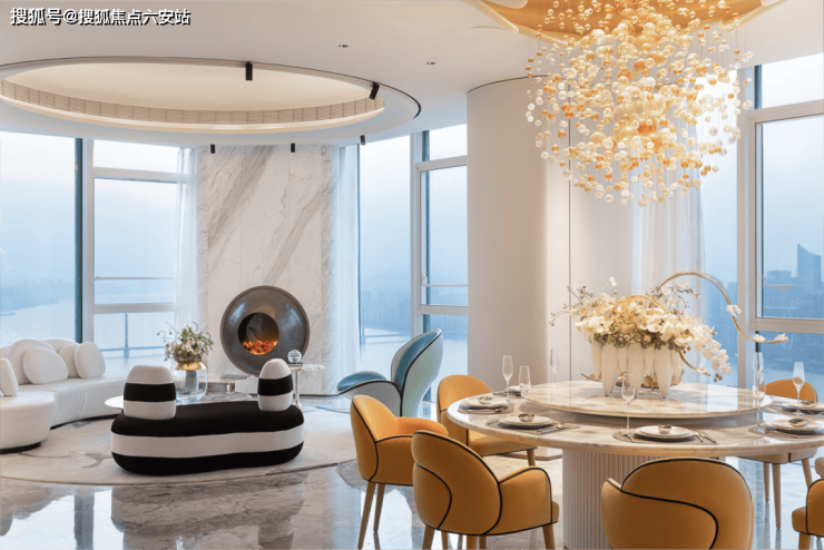 大尺度的景观视野,远眺钱塘江水,曲线包装转角结构柱,给客厅一个安定墙面及视觉焦点,窗外就是地标性的莲花元素,杭州奥体中心(大莲花),以及国际会议中心(大金球)。