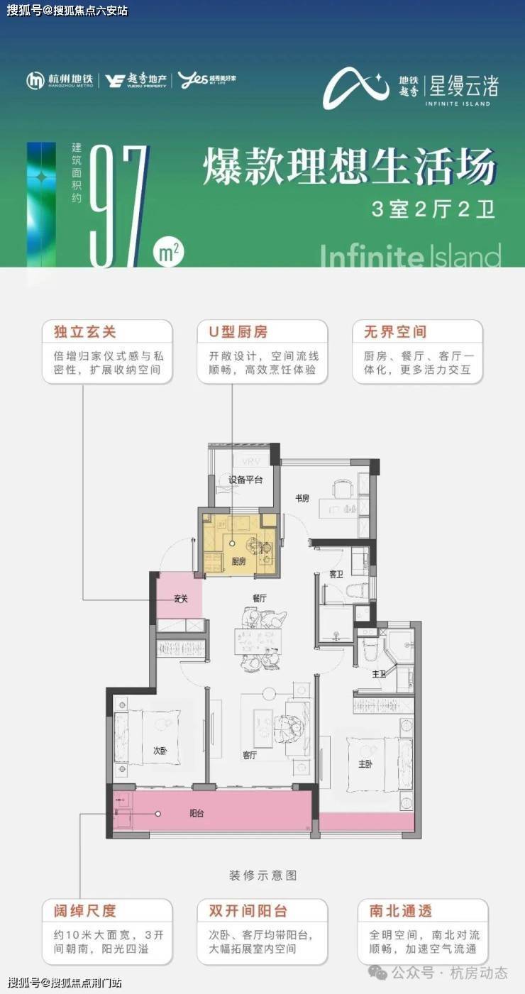 建面约97㎡起步户型,三房两厅两卫格局,南向三开间,次卧与客厅的阳台相连,打造大尺度的双联阳台,还有很大的亮点就是玄关设计,可以很好地护好后期业主的隐私。