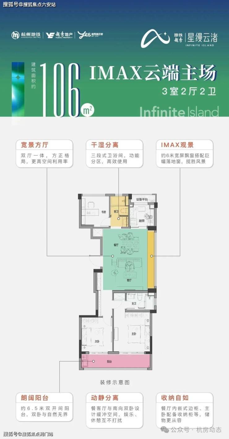 建面约106㎡的户型是市场上难得的小户型边套产品,南向双开间,同样的双联阳台打造,餐客厅一体化设计链接阔景飘窗,充分保证整个房间的采光面,后期居住舒适度更高。