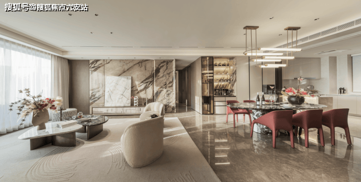 以意式美学生活作为出发点,设计师结合柔美的自然光线和原生纹理的天然奢石,通过大地原色模拟自然环境,创造湖畔生活的自然之奢;以毫厘精工的金石镶嵌、手工艺术的肌理编织和小众定制,展现空间每一处的工艺之美。