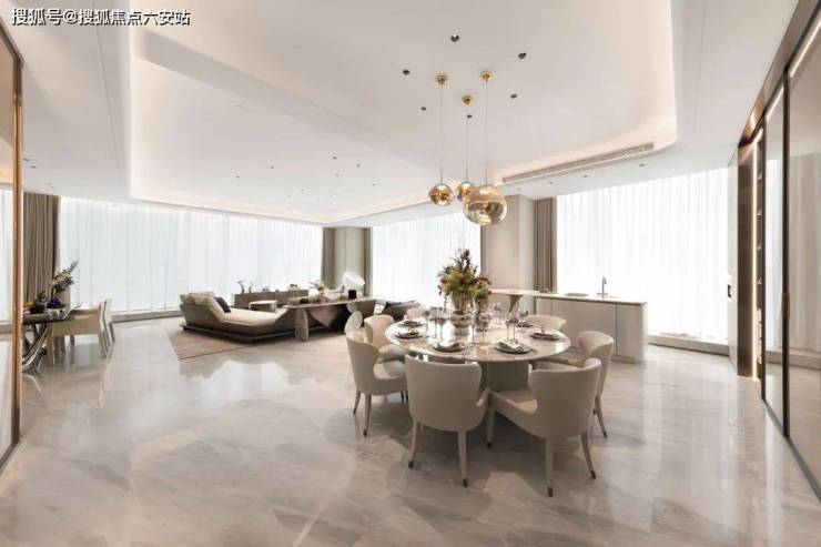 室内设计上,采用LDK一体化设计,带来极具阔正的空间尺度,并以大面米灰、暖灰为主基调,营造出高级优雅的氛围感,同时通过吊灯、艺术玻璃、酒柜等软装艺术作点缀,将艺术与生活融合,简奢中透出时尚前卫,营造出私密、温暖、现代化、国际化及独特的鼎级舒居体验。