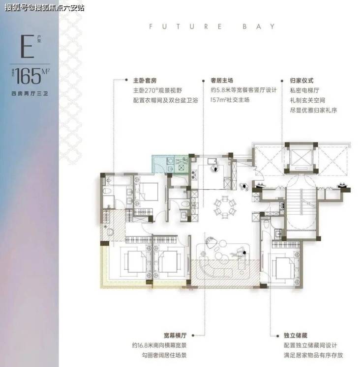约165方户型,16.85米超大南向开间,超过市场所有同面积段产品;标配储藏间。