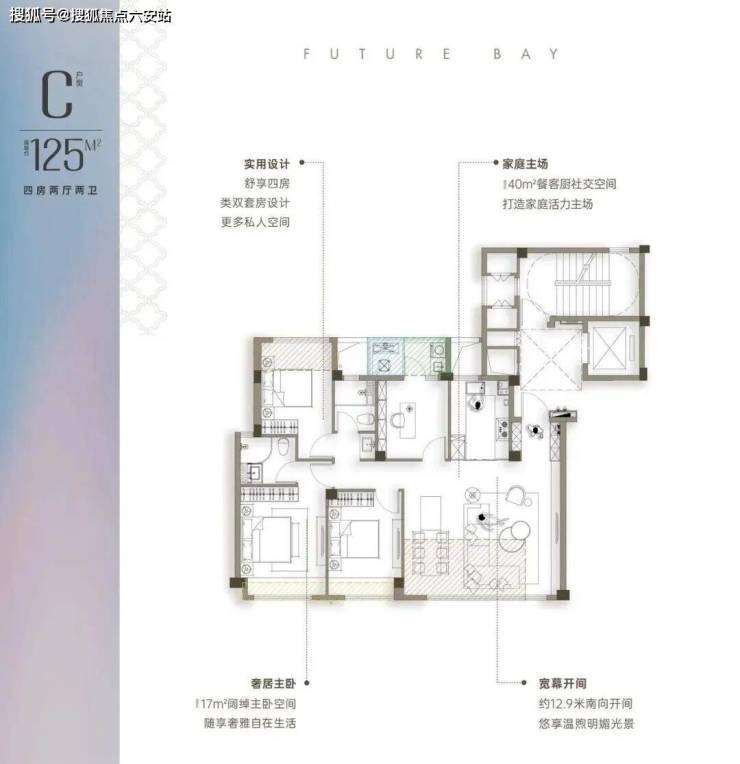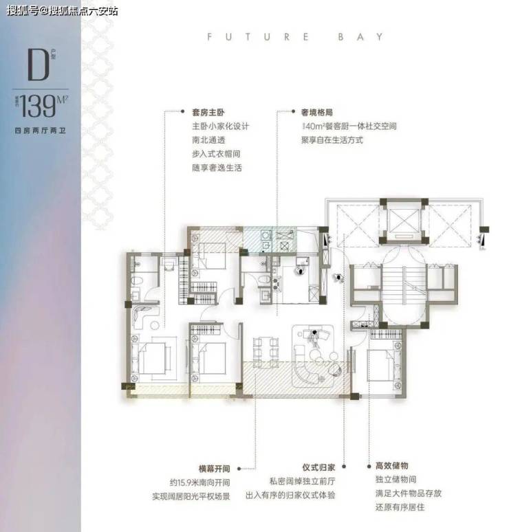 约139方户型, 4.5开间朝南+储藏间,南向15.9米超大采光面,做到五开间朝南的空间,标配储藏间,三个南向卧室设计。