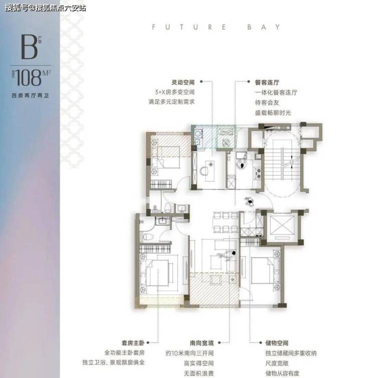 餐客厅开间6米,面积达到约60方,媲美200方大平层居住体验,主卧采用270度飘窗设计,可更好的提升主卧采光及景观。