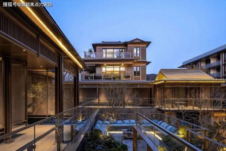 合院以香槟金为基调,缀以深色奢华石材,凝练古朴厚重之美;叠墅立面承袭云庐系现代东方风格,以香槟金与深色铝板为骨,融石材之雅与大面积玻璃之轻盈,在虚实交错间构筑光影流转的灵动意趣,赋予建筑静中见动的韵律之美。