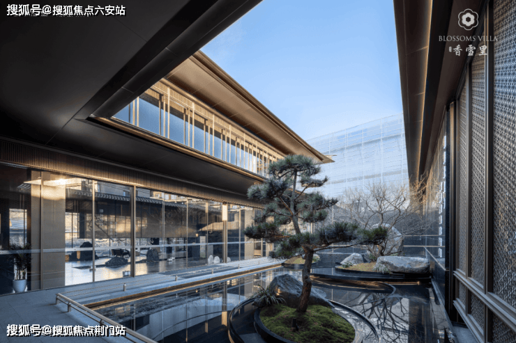 下沉庭院中,光影交织,潺潺流水映照婆娑树影,挺拔树姿注入向上生机,拉近建筑与自然的共鸣。镜面水庭倒映重檐飞角,玻璃幕墙将超山苍翠框成流动青绿画卷,与庭院景观相映成辉