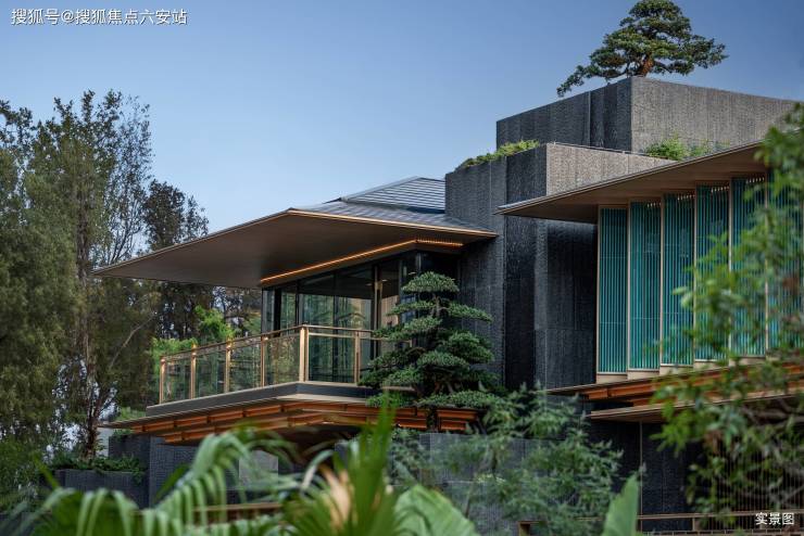 建筑立面匠心独运,演绎宋风当代表达。项目提取宋代歇山顶样式,转译形成深远的挑檐,整体呈现清雅内敛的气质;外立面采用新疆紫罗兰石材与Low-E玻璃幕墙,搭配臻选的靛蓝色陶瓦,打造原创蓝金坡屋顶,镶嵌金色铝线条的巨幕玻璃窗,形成极简化的光影天幕,倒映湖山盛景,掀起杭州合院立面的新序章。更耗时10轮打样,烧制46樘青瓷屏扇,还原宋画意境,颜值与质感兼具,每一处细节都彰显着匠心与格调。