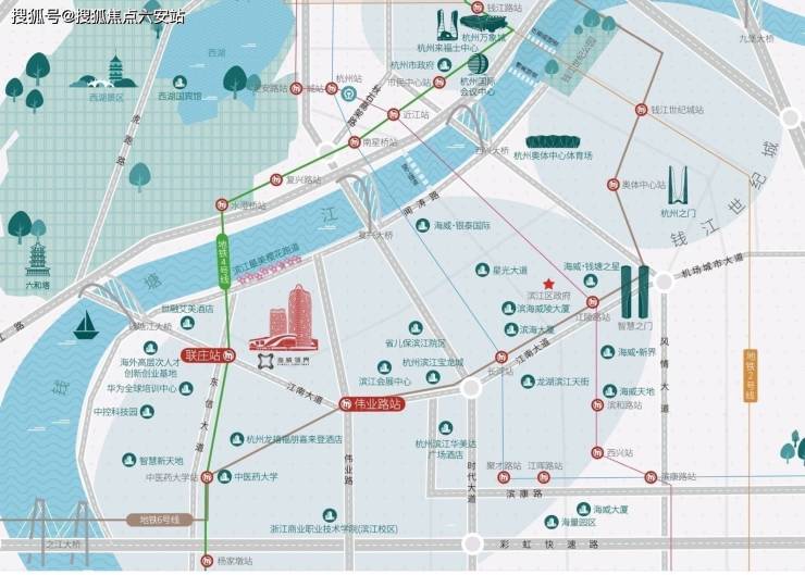 项目地处滨江核心区,紧邻地铁4号线联庄站D出口,步行可达6号线伟业路站,形成双地铁上盖格局。周边江南大道、复兴大桥等主干道环绕,可通过望江隧道、庆春隧道等跨江通道直达钱江新城商圈,构建“双主干道+四桥三隧道”立体交通网络,实现通勤圈覆盖。